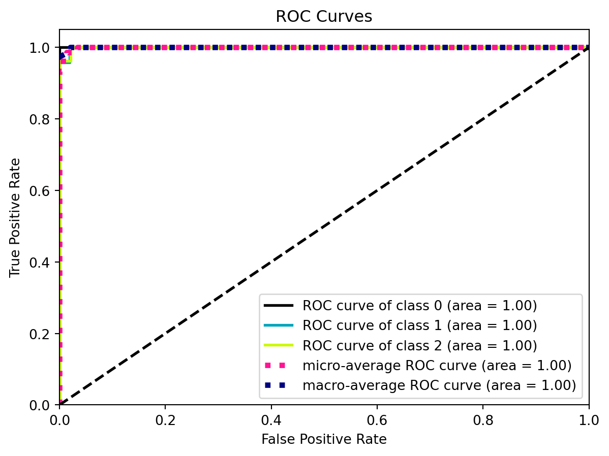 from sklearn.metrics import roc_curve, aucimport scikitplot as skplt# Plot ROC curve and AUC for each classskplt.metrics.plot_roc(y_test, y_probas)plt.show()